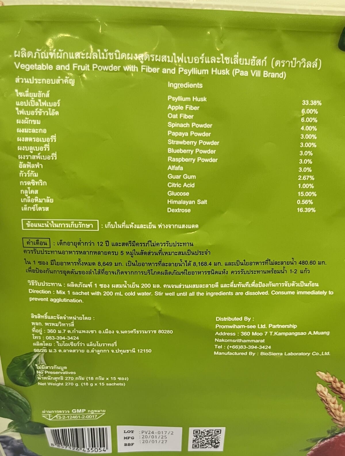 ใน 1 ซอง มีใยอาหารทั้งหมด 8649มก เป็นใยอาหารที่ละลายน้ำได้ 8168.4มก และเป็นใยอาหารที่ไม่ละลายน้ำ 480.60มก เพื่อป้องกันการอุดตันของลำไส้ที่อาจเกิดจากการบริโภคผลิตภัณฑ์ใยอาหารชนิดแห้ง ควรรับประทานพร้อมน้ำ 1-2 แก้ว