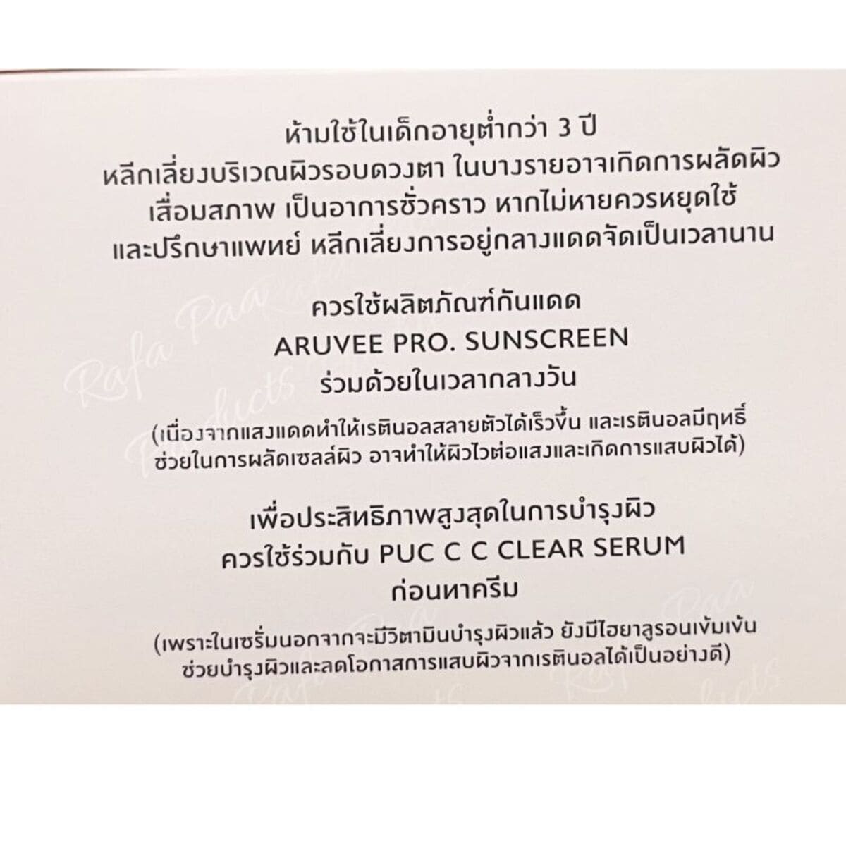 ** ควรใช้ร่วมกับผลิตภัณฑ์กันแดด Aruvee pro. Sunscreen ในเวลากลางวัน
